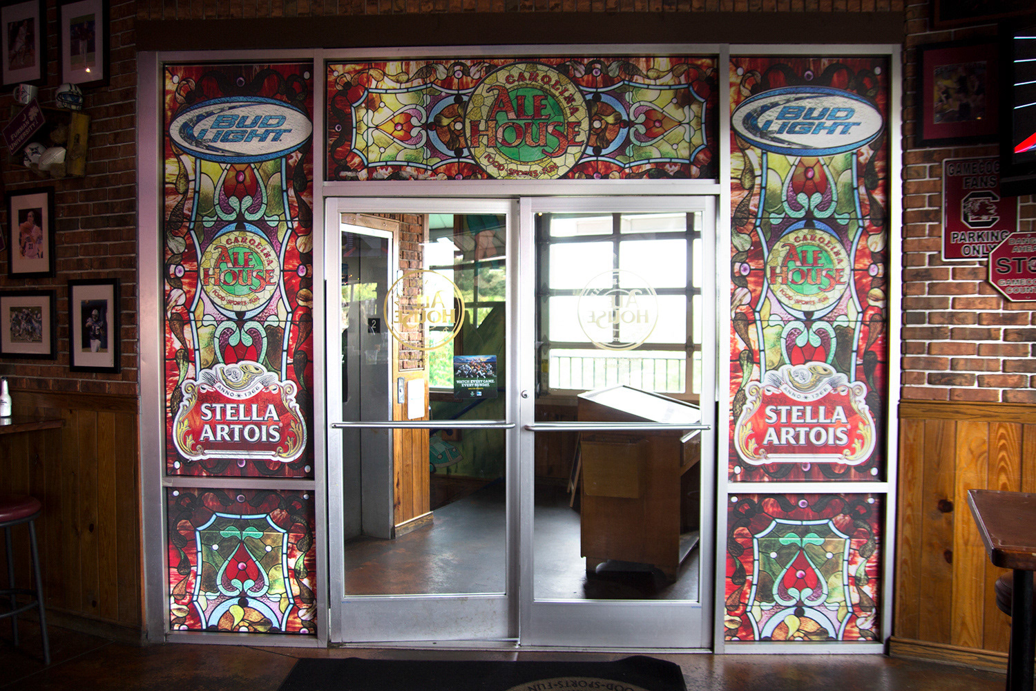 faux stained glass design for ENTRY way windows of restaurant